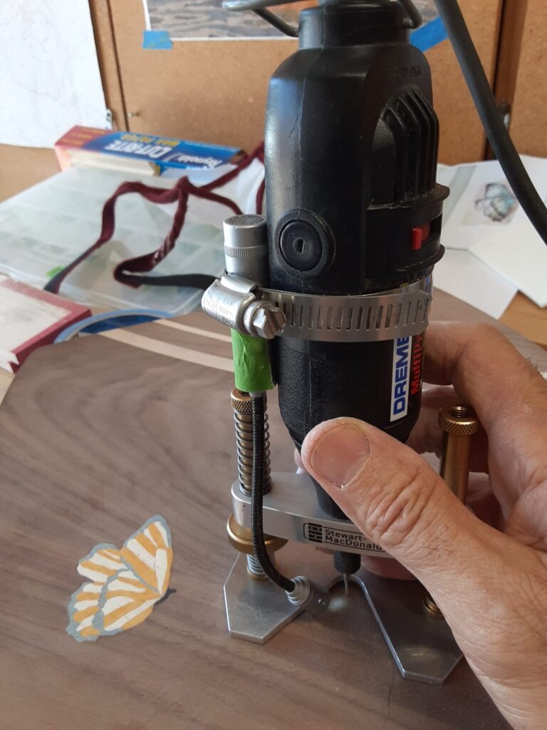 In creating inlaid marquetry, one of my great discoveries was a precision router base for my Dremel tool, by Stewart MacDonald. The accuracy for routing small details can be achieved to within a few thousandths of an inch (.001″).